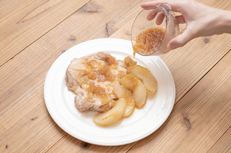 (1)ナシ(ソテー用)はくし形に切り、ナシ(ソース用)とタマネギはすりおろす。