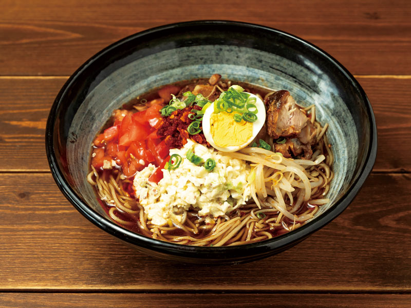 本格手打ち蕎麦の上に「自家製やみつきチャーシュー」、フレッシュトマト、マスタードマヨキャベツ、シャキシャキもやし、半熟卵をトッピング。