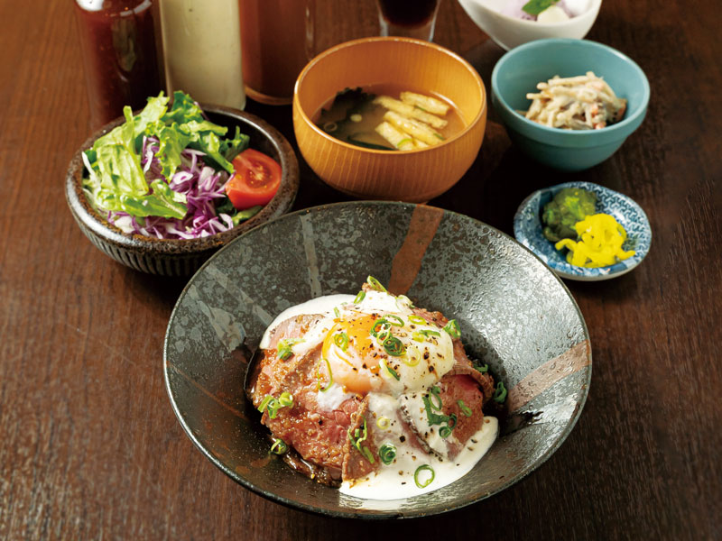 メインの丼はローストビーフを贅沢に重ね、半熟卵をトッピング。3種類からドレッシングが選べるサラダ、味噌汁、小鉢、漬物、コーヒー、アイス付き。