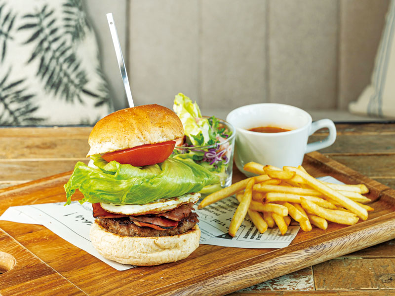 ベーコンエッグバーガー、ミネストローネ、シーザーサラダ、ポテトの豪華なプレートセット。ハンバーガーのパテはアメリカンビーフを手捏ねした肉感MAXな食べ応え!