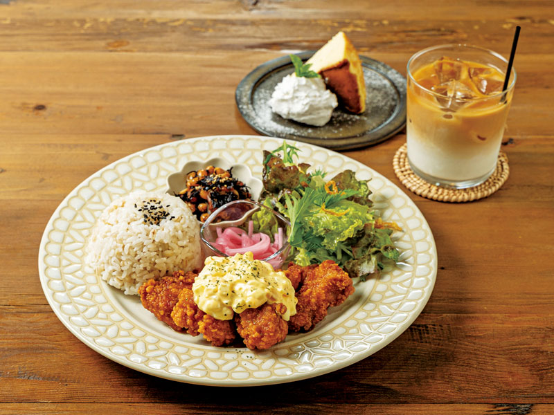 大きなおにぎりと具だくさんの味噌汁に日替わりの小鉢がついた和食のセット。どこか懐かしいほっこりする味で心温まるひと時を。※おにぎりは「鮭」と「ごまこんぶ」のみ
