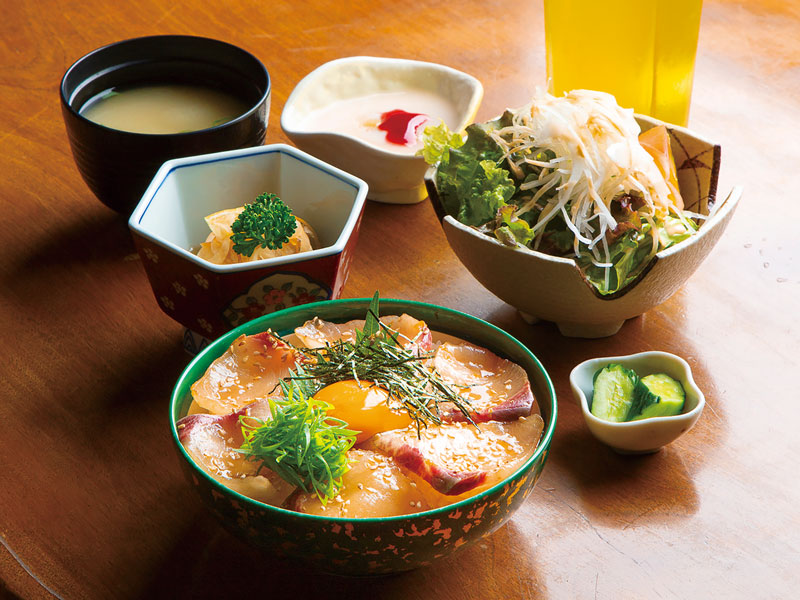 ハマチの漬け丼に、サラダ・小鉢・味噌汁・漬物・デザートが付いた欲張り定食。ハマチに生卵を絡めて、アツアツのご飯と一緒に頬張って!