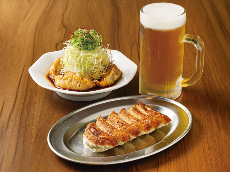 定番「焼き餃子」と、揚げ餃子に甘辛いソースをかけてネギをたっぷりとのせた「よだれ餃子」の食感が異なる2種類。アルコールは、ビールがおすすめ。