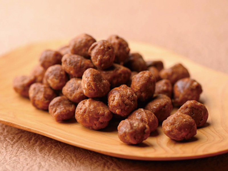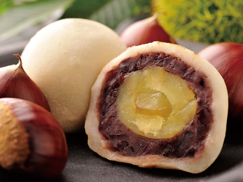 自家製蜜漬け栗と粒あんを、コシのある杵つき餅で包み、香ばしい玄米粉をまぶしています。