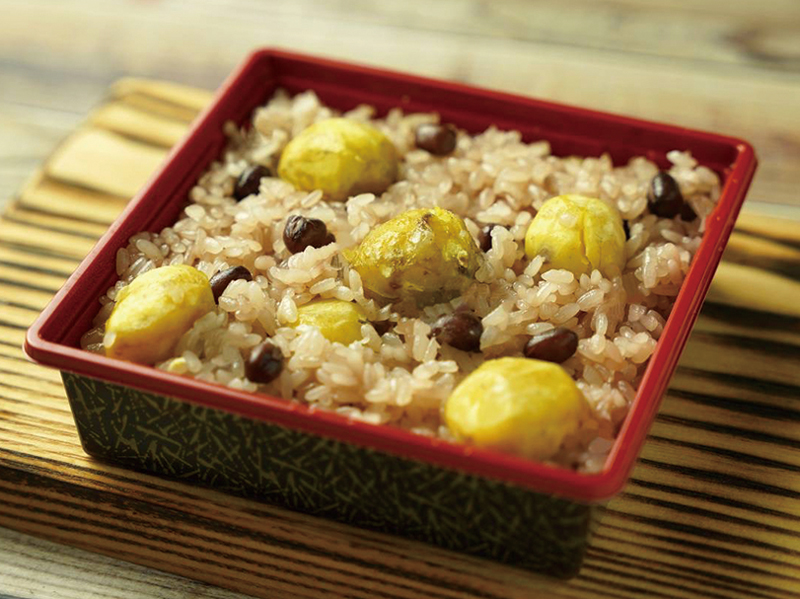 今秋収穫した国産栗の皮を一つ一つ丁寧に剥き、赤飯と一緒に蒸し上げています。 生栗のまま赤飯と共に蒸し上げた味わいは格別です。