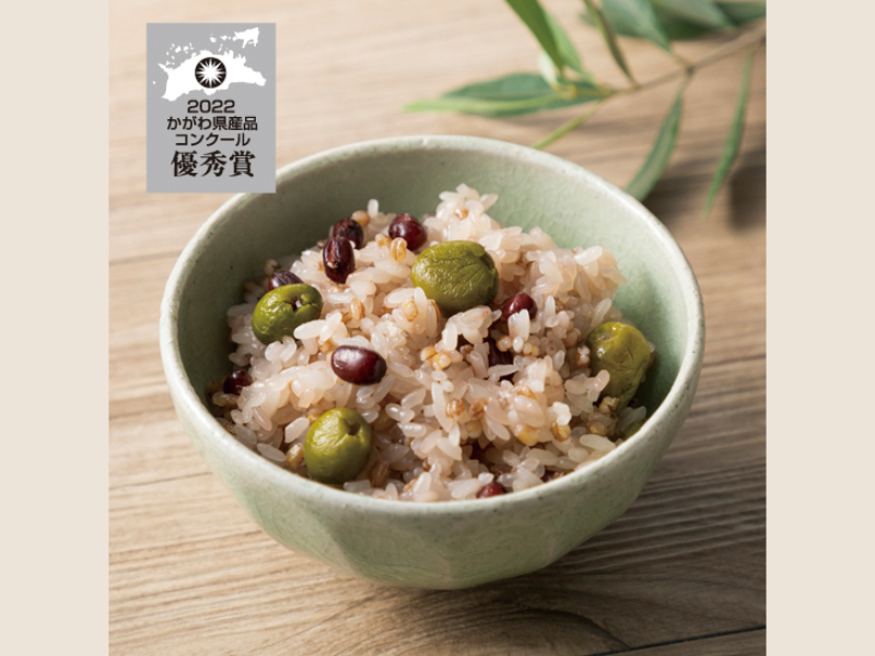 塩っぱさが新鮮な「小豆島産のオリーブの新漬け」を、「善通寺産のダイシモチ(もち麦)」を使ったおこわに入れました。「香川県産オリーブオイル」や「讃岐の藻塩」使用。