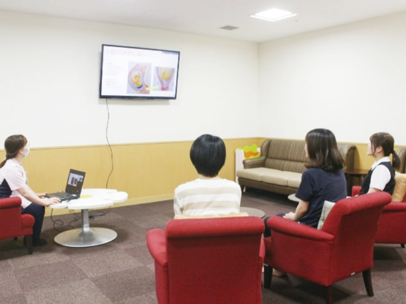 母性をより強く育むことを目的に「両親学級」を月に2回実施。ソフロロジー分娩やヨガの呼吸法など、動画を見ながら少しでも楽な気持ちでお産ができるように考えています。
