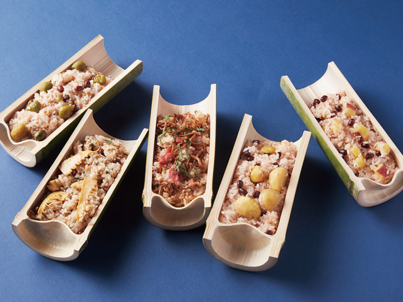5種類のおこわを天然の青竹に盛り付けたギフトにおすすめの逸品。かがわ県産品コンクール オリーブ部門で優秀賞を受賞した、「讃岐の新漬けオリーブおこわ」もお楽しみいただけます。