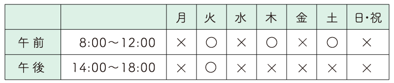 月曜、水曜、木曜午後、金曜、土曜午後、日曜、祝日