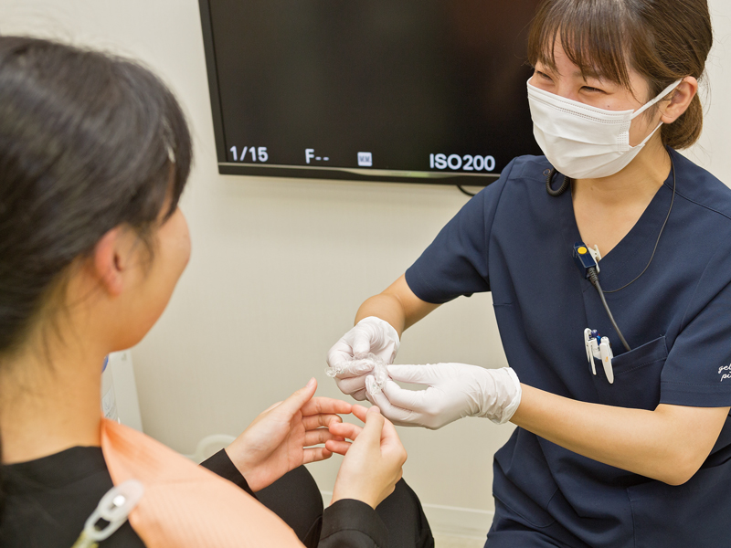 マウスピース型矯正装置の取り扱いについて、一つ一つ説明します。装着時間(20時間以上)やゴムかけのお約束を守って、しっかり使ってください。装置を外して食事や歯磨きができるので快適です。治療中のむし歯を防ぐためのカウンセリングも行います。