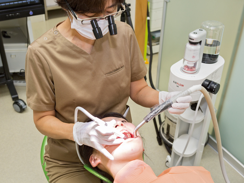 矯正治療中は歯に着色が目立ちます。研磨剤と回転ブラシで着色を落とすと、歯が傷つき、時間もかかります。当院では、柔らかい粒を吹き付けて、歯を傷つけず着色だけ落とす機械(Air Flow)を導入し、短時間で歯をキレイにします。