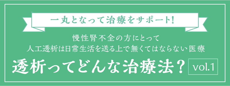 人工的に血液中の余分な水分や老廃物を取り除き、血液をきれいにする働きを腎臓に代わって行う治療法。透析療法には、機械に血液を通してきれいにする「血液透析」 と、患者さんご自身のお腹の膜(腹膜)を利用して血液をきれいにする「腹膜透析」の2つに大きく分けられます。