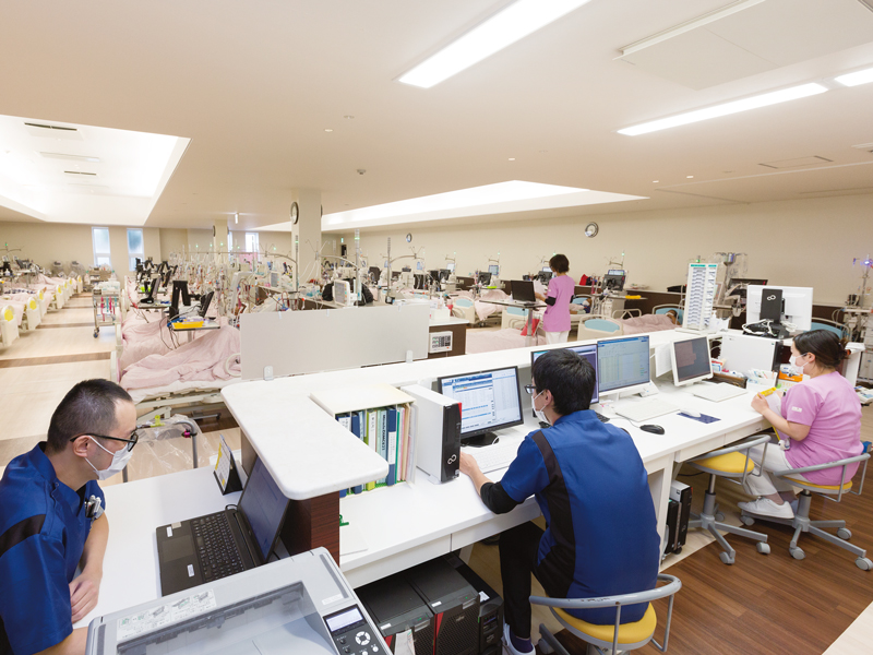 1983年の開設以来、地域の中核病院として慢性腎臓病や糖尿病性腎症の進行・予防から人工透析の導入まで腎臓病の治療に対応してきました。近年増加傾向にある透析患者さんに対しては、生活の質を守りながら透析治療を続けていただくことを最優先に考え、一人ひとりの生活背景や病状を考えた透析医療を提供。長期透析患者さんの高齢化や合併症も踏まえ、同院グループの療養施設からの送迎にも対応しています。