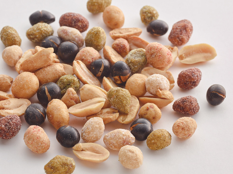 オンリーワンのおいしさを、70年間守り続けてきた製造現場からフレッシュな豆菓子がすぐに届けられるのは、できたて売り場の特権。「赤いのぼり・のれん」が目印。