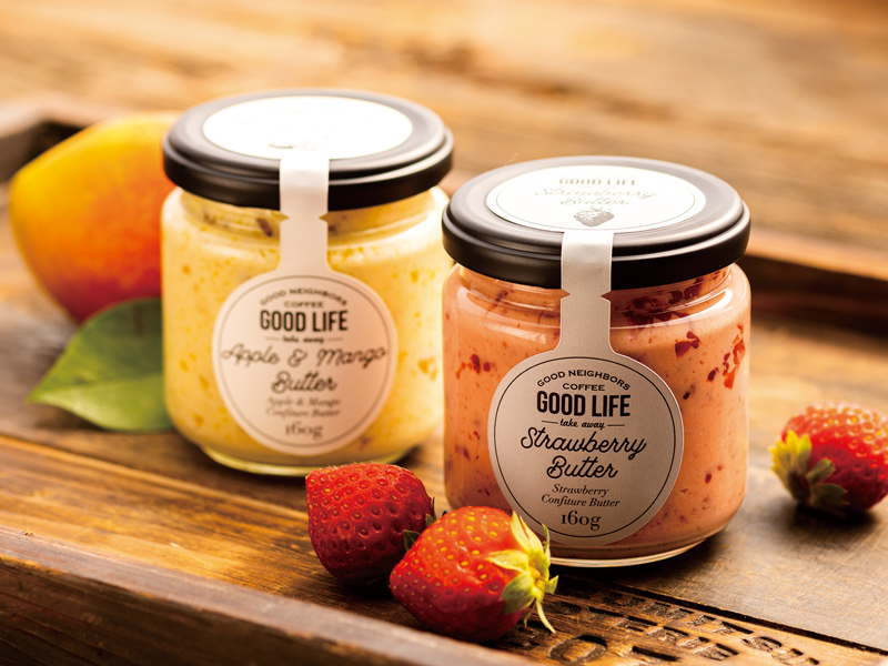 トーストを知り尽くしたGNCが心を込めて作り上げた逸品「幸せのフルーツバター」。「塗る」というよりたっぷり盛っていただくのがグッドネイバーズコーヒー流。熱々のトーストにぜいたくに乗せて、溶けないうちどうぞ。冷たいバターとフルーツが奏でる幸せの口どけを体験してみて。香川県産品コンクールで優秀賞受賞した新作「幸せのフルーツバターキウイ&もも(香川県産)」もいよいよ発売開始。購入はGNC各店舗で。
