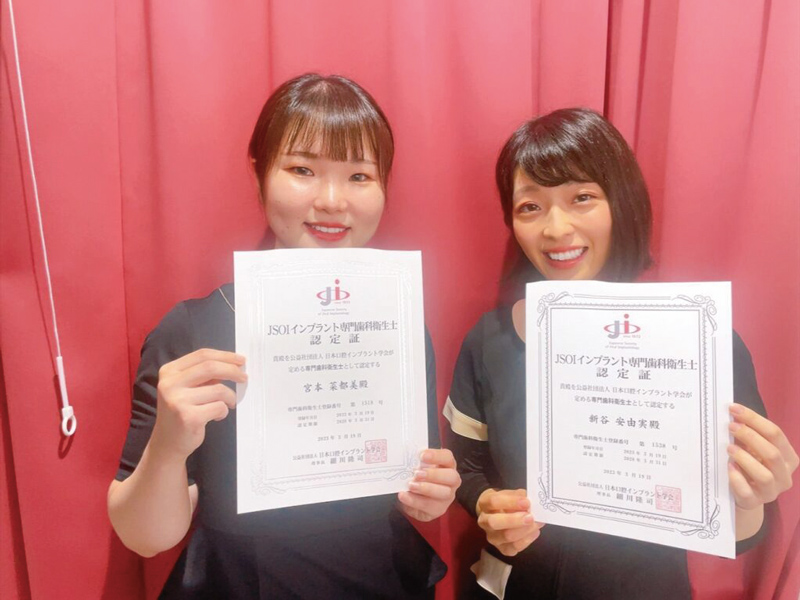 インプラント専門歯科衛生士とは、2023年12月現在香川では13名しかいない、インプラント治療やメインテナンスの知識と経験を学会に認定された証です。Drだけでなくスタッフも常に勉強を絶やさず、より良い治療を提供できるよう頑張っています。