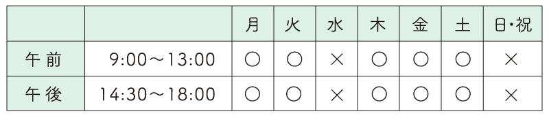 診察時間:9:00~13:00(午前)、14:30~18:00(午後)