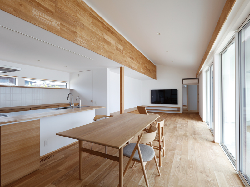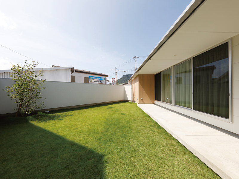 その土地の形、方角、周辺建物の間から差し込む光、そして、過ごす人の生活動線から生まれた、「くの字」の家。真南に面したリビングには大きな窓を配置しつつ、深い軒でちょうどいい日射取得を実現。テラスから繋がる庭には、プライバシー性の維持に加えて景観を明るくする白い壁を計画しました。「歩く距離が少ない!」と、訪れた人を驚かせる動線計画の工夫はもちろん、くの字であることを感じさせない無駄のない間取りを提案。デザインや動線のみならず断熱気密性も確保した、池田設計室の目指すちょうどいいシンプルさを体現した白い平屋です。