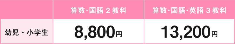 幼児・小学生/算数・国語 2教科:8,800円、算数・国語・英語 3教科:13,200円