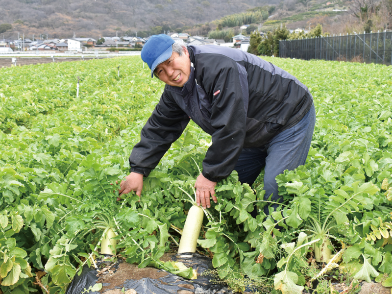 ニンジンやサツマイモの栽培が盛んな坂出市ではダイコンの栽培も盛ん。「坂出園芸センター大根部会」には15名が所属し、合わせて約60haの農地で栽培。ダイコンは日当たりがよく風通しのよい場所を好むため、栽培環境を整えることが大切。「春ダイコン」の場合、発芽させるためにビニールで覆うが、風通しをよくするために換気口をあけたり、温かい場所を好んで虫が入ってくるので防虫対策も行う。そして、適期に収穫作業を行うことで、おいしいダイコンを出荷している。