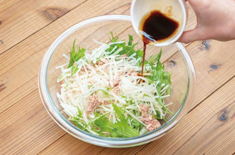 (2)ダイコンを絞って水気を切り、水菜を加え、【A】と和える。