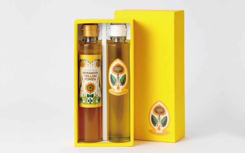 まんのう町で採れたひまわりの種だけを使った、琥珀色の「まんのうひまわりオイル」。悪玉コレステロールを下げたり、美肌効果もあるオレイン酸の含有量が90%以上と国内最高値。ビタミンEはアーモンドよりも多く、がんの抑制効果や強い抗酸化効果に期待も。ナッツのような芳ばしい風味とまろやかな甘み、植物由来のすっきりとした味わいが特徴です。また、新商品の「黄色いひまわりぽん酢」は、ビタミンEとオレイン酸たっぷりの「まんのうひまわりオイル」を贅沢に使用。さらに種から抽出したポリフェノールも配合。ぽん酢にとらわれない和洋中の料理に使える健康志向の逸品!贈り物にぜひ。