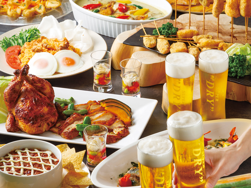 世界各国の豊富な種類の料理がビュッフェ方式で食べ放題。好きなメニューを好きなだけいただけると毎年大好評。またさぬきのめざめや讃岐の練り天など目の前でアツアツが提供される揚げ物などもこちらならでは。サムギョプサルやFLAGカレー、グリーンカレーなどリピーターの多い人気メニューもチェック。ビールはもちろん各種カクテルやサワーなどドリンクの種類も大満足。