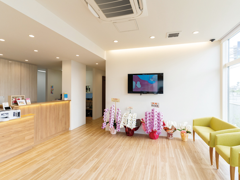 清潔感のある待合室は大きな窓から光が差し込み、幅広い世代が利用しやすいように完全バリアフリーを採用。