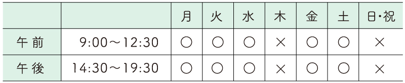 ※受付時間は診療時間の30分前、臨時休診日あり。