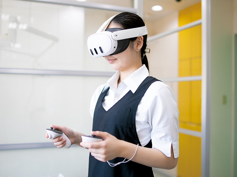 スタッフの質の向上と円滑に治療を進めていくため、VR技術を融合させた歯科教育用シミュレーションシステムを導入。2次元(2D)では困難であった空間認識が容易になり、誰もが分かりやすいデータとして活用できることを目指しています。