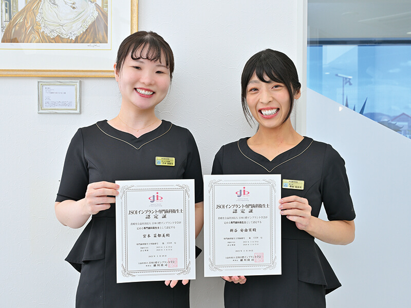 当医院にはインプラント専門の歯科衛生士が2名在籍しています。インプラント専門歯科衛生士とは、香川県では13人しかいない(2023年12月現在)、インプラント治療やメンテナンスの知識と経験を学会に認定された証です。歯科医師だけでなく、スタッフも常に勉強を絶やさず、より良い治療を提供できるよう頑張っています。