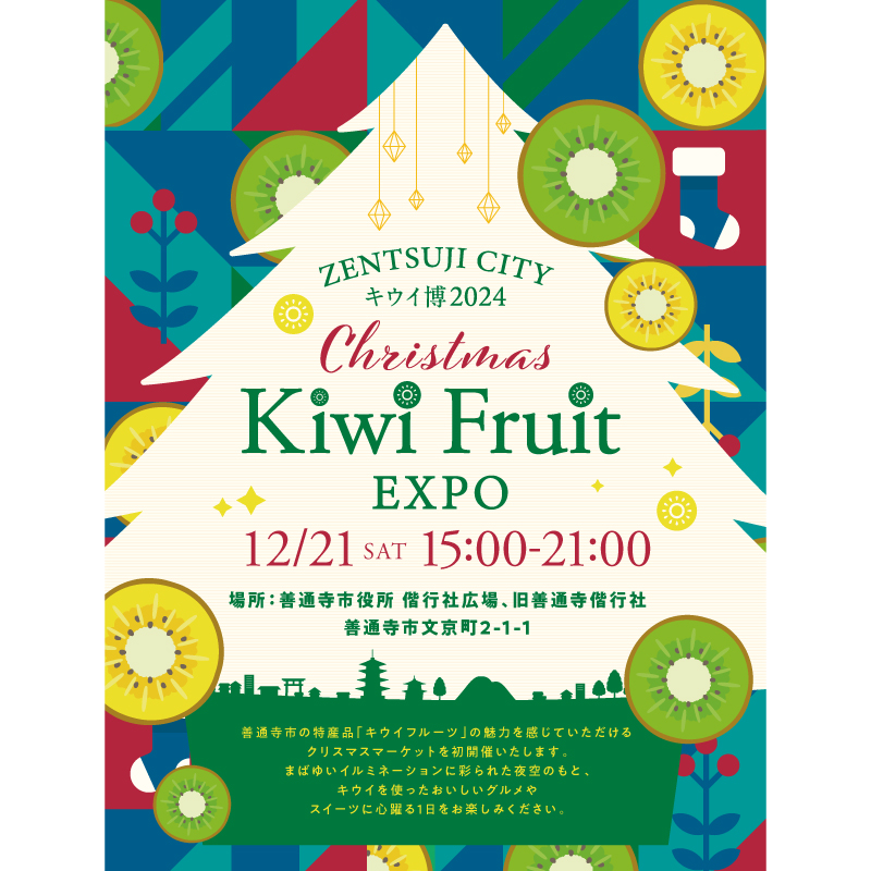 善通寺市の特産品「キウイフルーツ」の魅⼒を感じていただけるクリスマスマーケットを初開催いたします。まばゆいイルミネーションに彩られた夜空のもと、キウイを使ったおいしいグルメやスイーツに⼼躍る1⽇をお楽しみください。