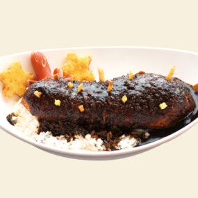 ナマコをモチーフにしたインパクト大のカレー。ベーコンポテトドッグに黒いカレー、下にはお米を敷いて海底をイメージ。