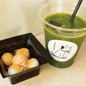 全て国産素材を使用。がま口や御朱印帳に使用しているジャガードは光沢があるので上品な風合い。店舗限定の「グリーンティーソーダ(400円)」と「みたらしだんご(350円)」。旅のお土産探しにぜひ立ち寄ってみて。