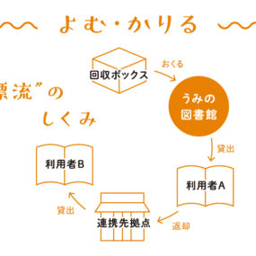 海に関する小説や図鑑「海にまつわる本」と、全国各地から寄贈された「漂流してきた本」の2種類がある。“本が漂流する仕組み”として全国に拠点を作り、本の返却・貸出ができる拠点を設置する予定。