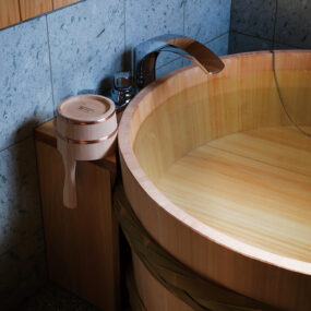 旅の疲れを癒すお風呂は「木桶職人復活プロジェクト」のチームが制作した木桶風呂。